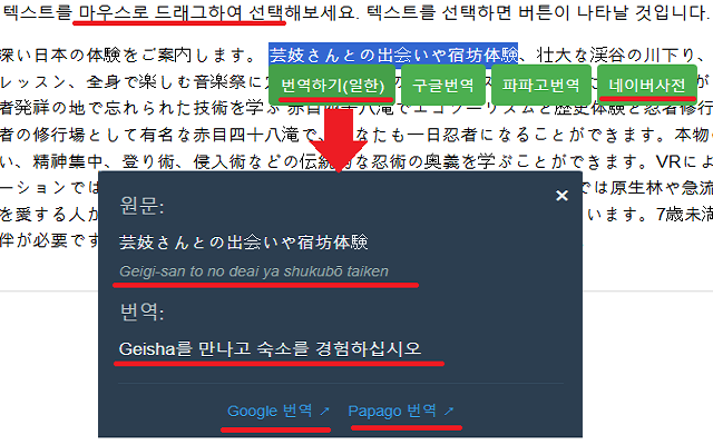 마우스로 선택한 일본어 텍스트를 한국어로 번역해주는 확장 프로그램. 구글번역, 파파고번역, 네이버사전 연결
